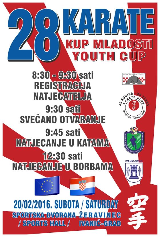 U subotu, 20. veljače održat će se 28. Međunarodni karate kup Mladost 2016 u Ivanić-Gradu. Ovaj tradicionalni karate kup okupit će u sportskoj dvorani Žeravinec vrsne natjecatelje, dječake i djevojčice, u dobi od 6 do 15 godina koji će se natjecati u disciplinama kata i borbi.