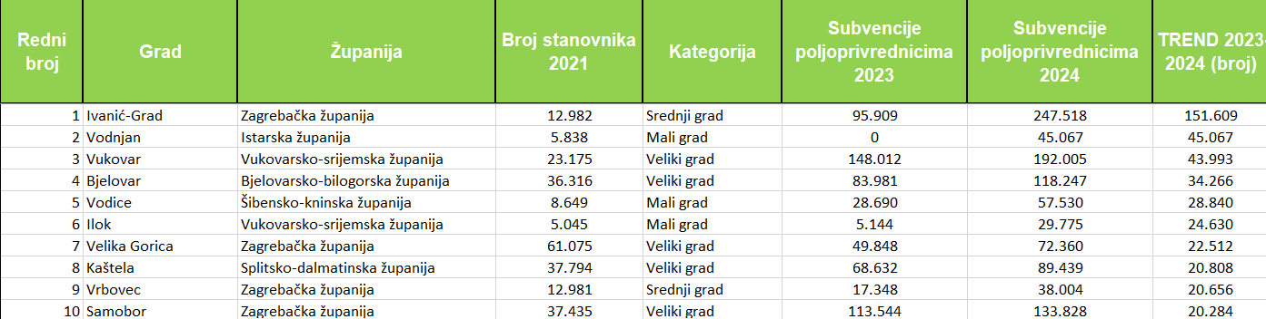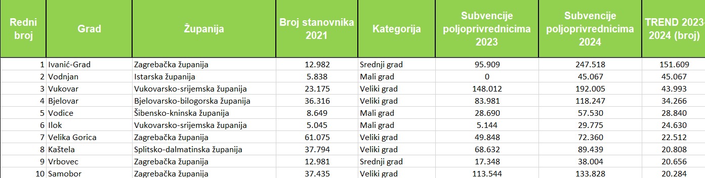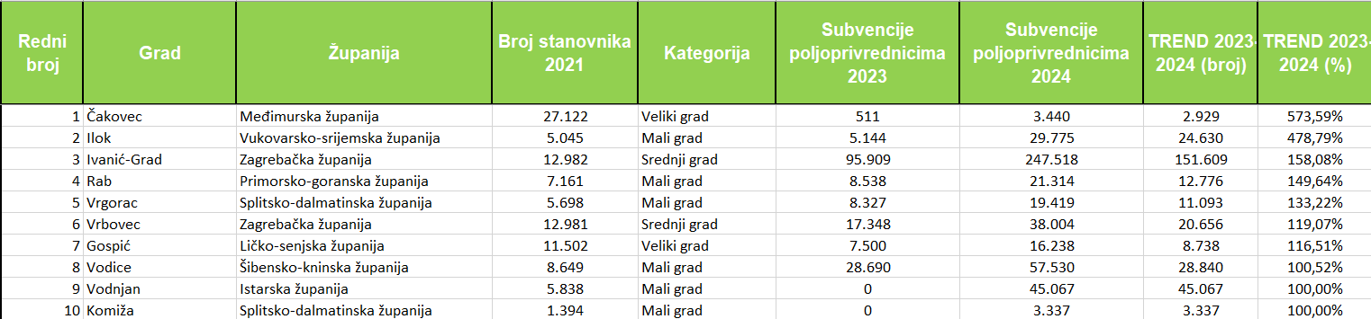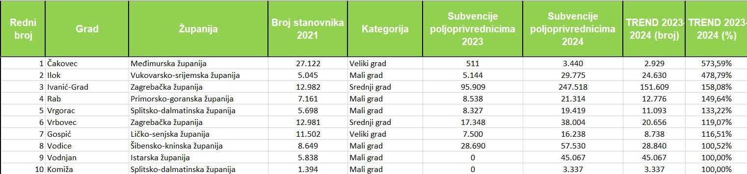 Ukupno je lani sredstva za subvencioniranje poljoprivrednika povećalo 48 gradova, pri čemu njih 19 za više od 50 posto. Najveći postotni porast izdvajanja zabilježio je Čakovec (+573%), slijede Ilok (+479%), Ivanić-Grad (+158%), Rab (+150%), Vrgorac (+133%), Vrbovec (+119%), Gospić (+116%), Vodice (+100,5%) te Vodnjan i Komiža, s formalnim skokom od 100% (iz 0 na konkretan iznos).