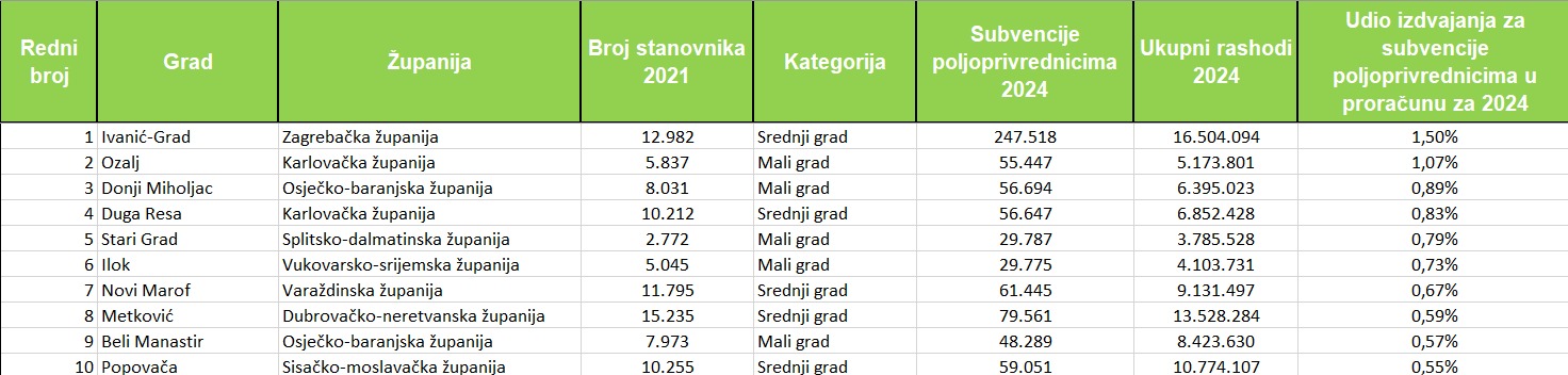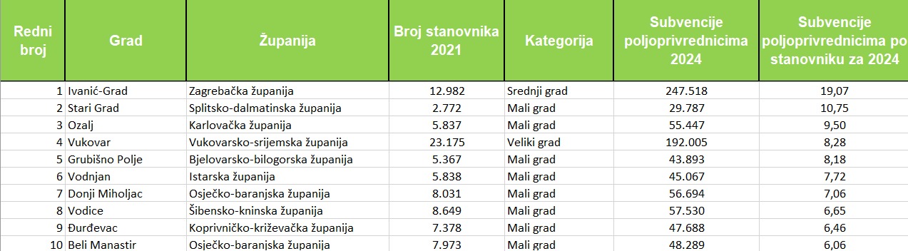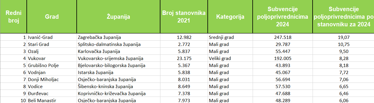 Prema izdvajanjima za poljoprivrednike po glavi stanovnika uvjerljivo vodi Ivanić-Grad, koji je u 2024. osigurao 19,07 € po stanovniku. Iznad 10 € po stanovniku dosegnuo je još jedino Stari Grad na Hvaru (10,75 €). U vrhu su i Ozalj (9,50 €), Vukovar (8,28 €), Grubišno Polje (8,18 €), Vodnjan (7,72 €), Donji Miholjac (7,06 €), Vodice (6,65 €), Đurđevac (6,46 €) i Beli Manastir (6,06 €). Ukupno je 16 gradova izdvojilo više od pet eura po glavi stanovnika, njih 39 izdvojilo je između jedan i pet eura, a njih 48 ispod 0,02 centa.